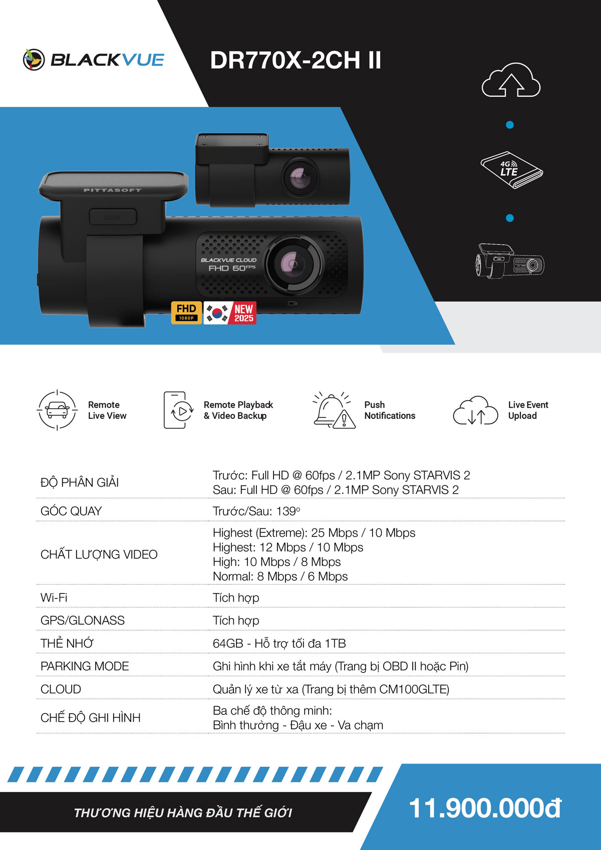 - Camera hành trình Blackvue DR770X-2CH II mang đến hình ảnh rõ nét vượt trội cả ngày lẫn đêm cùng khả năng kết nối BlackVue Cloud.