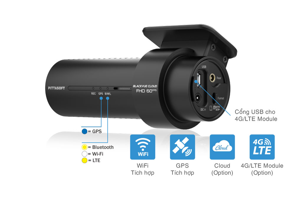 - Wi-Fi tích hợp: Kết nối trực tiếp BlackVue với điện thoại hoặc máy tính bảng, đồng thời truy cập Cloud qua bất kỳ điểm phát Wi-Fi nào.