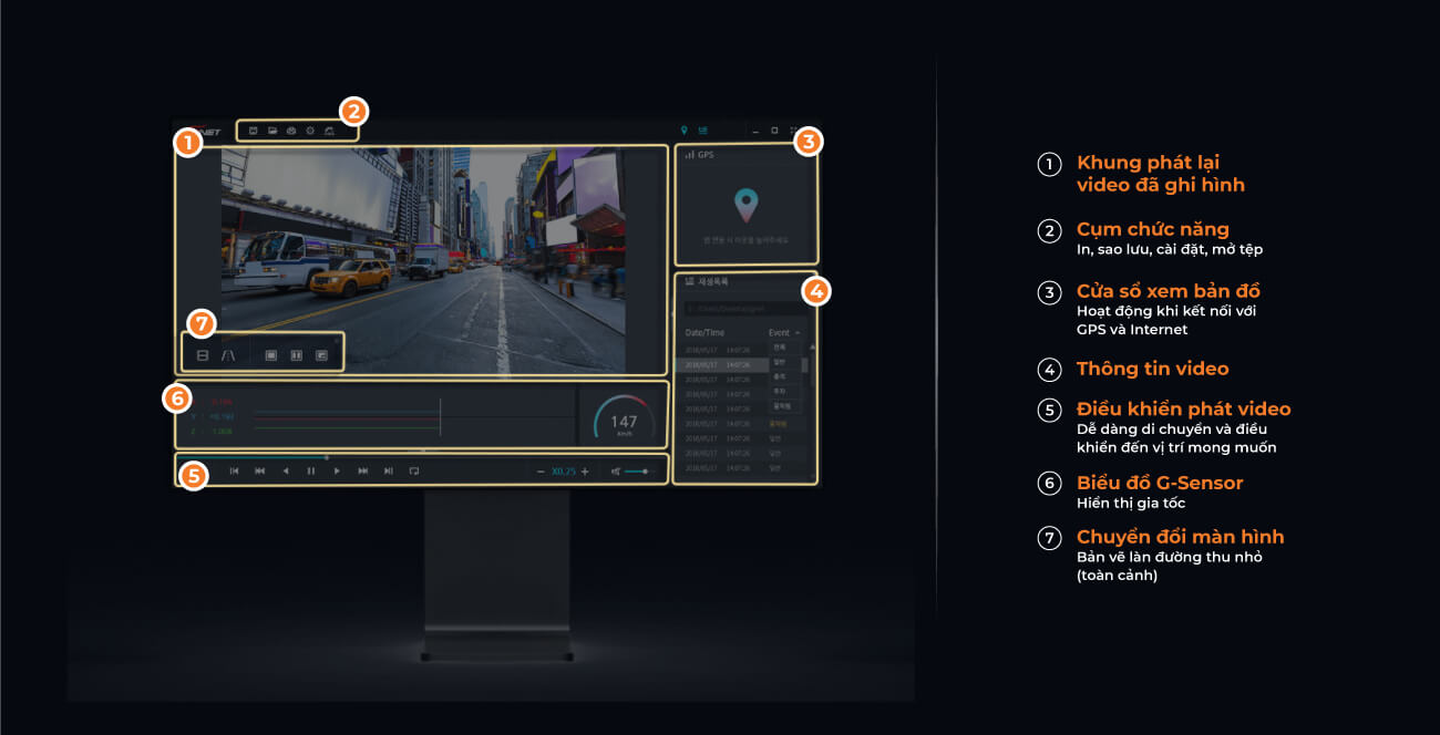 Cung cấp các chức năng khác nhau Thu phóng, chức năng thu phóng một phần, chức năng vẽ làn đường, thiết lập khung ghi hình, sao lưu tập tin MP4, ngăn chặn giả mạo, hình thu nhỏ và tìm kiếm lặp lại theo khoảng thời gian.